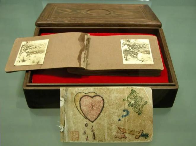 激愤难平的罗瑾为保存罪证,冒着生命危险偷偷加洗了30余张照片,并用硬纸自制小本子,选取 16 张装订成册,还在相册封面画图: