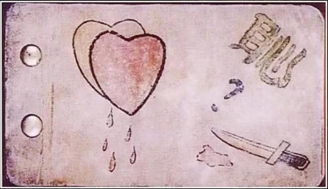 左边是两颗鲜红的心脏,右下方一把利刃刺向心脏,滴出鲜血。